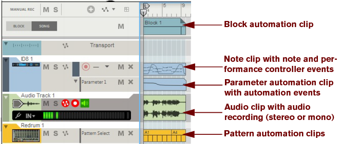 Clip basics Only the basic properties and functions pertaining to clips are described here. See “Arranging in the Sequencer” for in-depth details about what you can do with clips. Clip types Here are the different clip types: • Block automation clips (only if Blocks are on) that contain information of which Block should play back. • Note clips contain note events with velocity values. Note clips can also contain performance controller events. • Parameter automation clips contain events for an automated device/channel strip parameter. A parameter automation clip can easily be distinguished by the shape of its frame: the top right corner is “cut off”. • Audio clips contain mono or stereo audio recordings. If the audio clip is a Comp clip, or a Single Take clip which contains several takes, there is a small symbol in the lower right corner of the clip. • Pattern automation clips contain device bank+pattern number.