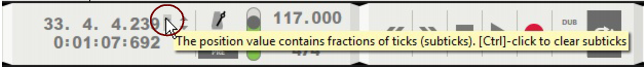 • Alternatively, press [*] on the numeric keypad or hold down [Ctrl](Win) or [Cmd](Mac) and press [Return] on the computer keyboard. If Pre-count has been activated (see Pre(-count) On/Off above), the recording will begin after the set number of pre-count bars.Clicking on any of these buttons will add additional audio tracks or note lanes for overdub purposes. Refer to “Overdubbing audio using the “Dub” function” and “Recording notes using the “Dub” and “Alt” functions” for more details about these functions.The current positions of the Left and Right Locators in the Ruler (see Ruler details) are shown in the displays. The display is divided into Bar, Beat, 1/16th Note and Ticks (there are 240 Ticks for each 1/16th Note). You can change the positions of the Locators, and thus change the loop playback region, according to the descriptions in “Transport Panel segment displays”.