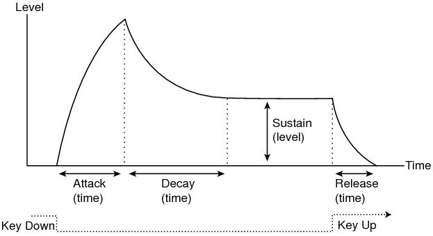 But often a combination of Decay and Sustain is used to generate envelopes that rise up to the maximum value, then gradually decreases to finally land to rest on a level somewhere in-between zero and maximum. Note that Sustain represents a level, whereas the other envelope parameters represent times.Finally, we have the Release parameter. This works just like the Decay parameter, except it determines the time it takes for the value to fall back to zero after releasing the key.