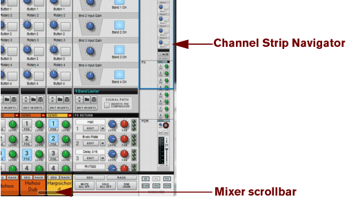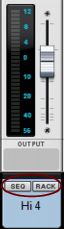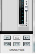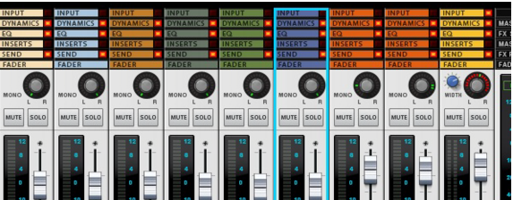 Each section has a section name header in the channel strip. The sections are as follows (from the top down): Input, Dynamics, EQ, Inserts, FX Sends and Fader. (See “The channel strip” for descriptions of each section.)The channel will get Edit Focus (see “Channel Header section”) and be scrolled into view in the Main Mixer. If you have both the sequencer and Main Mixer in view, or the rack and Main Mixer, clicking a track in the Track List, or on a Mix Channel/Audio Track device in the rack, will flash the corresponding channel strip in the Main Mixer.