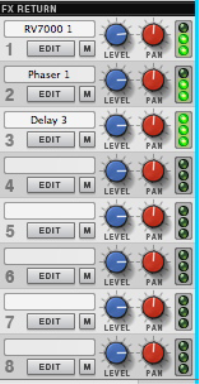 This section controls the master levels of the FX Returns. Send effect devices are connected to the Master Section via the eight FX Send and eight FX Return connectors on the Master Section device. See “Send FX” for a description of Send FX.