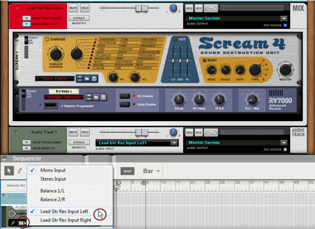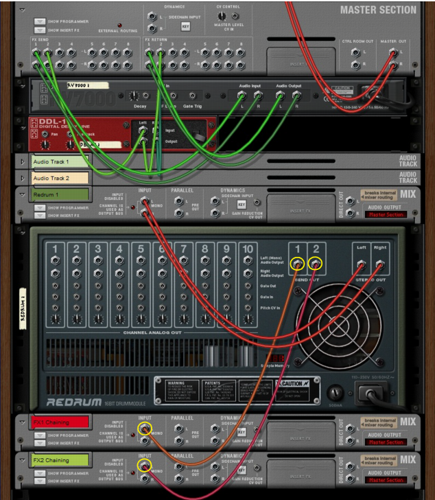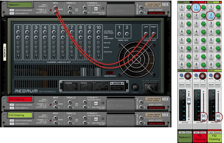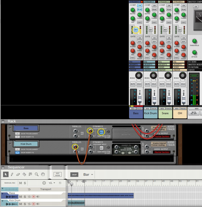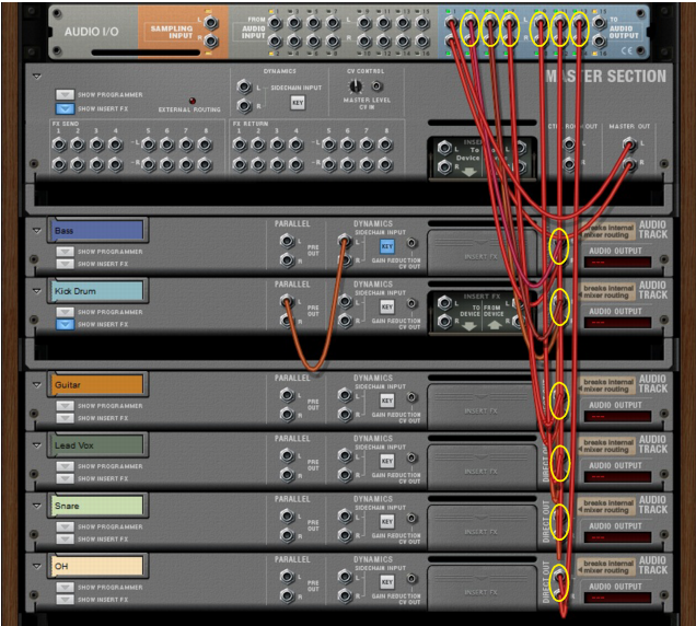 • Use a “Spider Audio Merger & Splitter” device to split the sidechain signal from the Parallel outputs and/or Insert FX “To Device” output into several signals.See “Output Busses” for information.Another typical application for compression sidechaining is to use the internal signal of the channel, filter it, and then feed to the compressor via “internal” sidechaining. This type of internal sidechaining can be used for de-essing, for example. No additional patching is required for this; you only have to activate the “Filters to Dynamics Sidechain” button in the Filter or EQ sections. See “About the Filters To Dynamics Sidechain button”.The Mix Channel and Audio Track devices feature Direct Out connectors. By patching cables into these outputs, you break the internal signal chain from the device to the Master Section, and can route the channel output signals directly to the Reason Hardware Device’s outputs. This is a very nice feature if you want to use outboard mixing or summing - or if you’re using ReWire (see “ReWire”) to route individual channel signals to another application.Direct routing of individual channel outputs to individual outputs on the Reason Hardware Interface.Now, you can begin recording on the Audio Track according to the standard recording procedures described in “General recording procedure”. The signal will be processed by the Insert FX of the Mix Channel device before being recorded on the track.