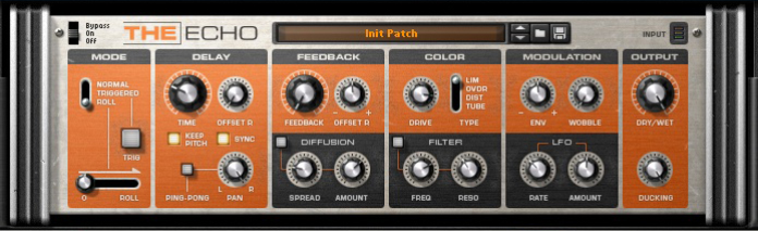 The Echo Introduction The Echo is an advanced stereo in/out echo and delay device with a multitude of parameters for tweaking the color and shape of the echo effect - diffusion, filtering, distortion and more. In addition to the normal mode where The Echo behaves like a regular send or insert effect, there are two additional modes called Triggered and Roll which let you automate momentary echo effects as well as create interesting stutter and repeat effects on the fly. The Echo also features breakout jacks which allow you to insert any number of other effect units into the feedback loop - this opens up endless possibilities for creative sculpting of the echo repeats. About the Patch format The Echo features programmable effect presets. Included are a number of Factory Patches which can be used as-is or provide you with a good starting point for further tweaking. The Patches use the file extension "*.echo". Loading and saving Patches is done in the same way as for instrument devices.
