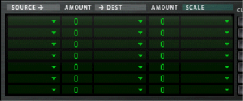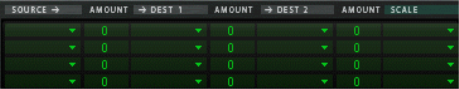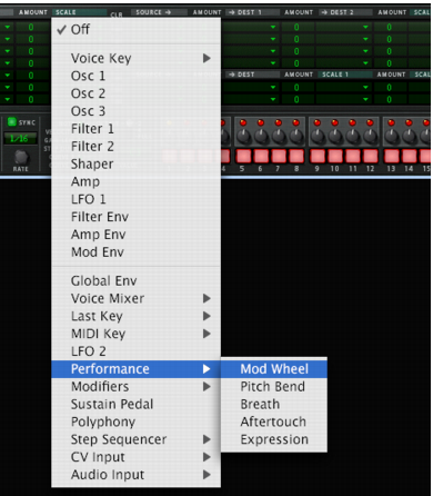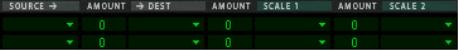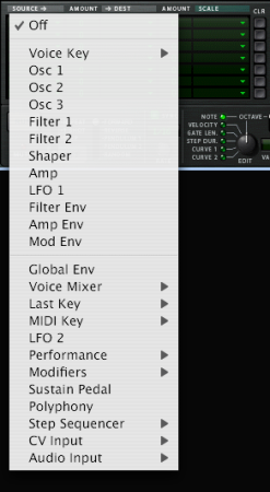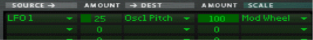 Modulation bus routing section A modulation bus is used to connect a modulation source to a modulation destination. Both audio signals and control (CV) parameters are available. This creates a flexible routing system that complements the pre-wired routing in the Voice panel. Basic operation - simple tutorial To illustrate the basic operation of the modulation bus section, let’s set up a simple source to destination modulation assignment: If you currently have unsaved settings you wish too keep, don’t forget to save them first. 1. Select “Reset Device” from the Edit menu. The Init patch is a simple 1 oscillator/1 filter setup, which produces sound when you play, and will serve the purpose of this tutorial. • The left half of the modulation section contains 5 columns, Source, Amount, Dest, Amount and Scale. Below the column headers there are 7 rows. Each row is a modulation bus where you can have a Source to Destination modulation assigned. 2. Click in the top row of the leftmost Source column. A pop-up menu appears listing all available Source modulation parameters. The upper half of the menu contains Voice section source parameters, and the lower half contains various global play and performance-oriented source parameters and the Global Envelope, as well as the Step Sequencer, CV and Audio inputs. 3. Select “LFO 1” from the pop-up. This means that LFO 1 is the modulation Source, and this can now be assigned to modulate a Destination parameter. 4. Pull down the “Dest” column pop-up in the top row. A pop-up menu appears listing all available modulation Destinations. The upper half of the menu contains Voice section destinations, and the lower half contains Global section destinations, as well as the Step Sequencer, CV and Audio outputs. 5. Select “Osc 1” from the menu and then “Pitch” from the submenu. This means that Osc 1 pitch is now assigned to be modulated by LFO 1. Next step is to set the amount of modulation to be applied. 6. Click in the top row Amount column to the right of the Source column, and move the mouse pointer up and down to set an Amount value. Both positive and negative Amount values can be set (+/- 100%). If you now play a few notes you can hear the oscillator pitch being modulated by the LFO to produce vibrato. But the vibrato will be constant, which you probably don’t want. This is solved by assigning a Scale parameter, which allows you to assign another parameter to control the modulation Amount. 7. Pull down the “Scale” column pop-up in the top row. A pop-up menu appears listing all available Scale parameters. The upper half of the menu contains Voice section parameters, and the lower half contains various play and performance-oriented parameters and the Global Envelope, as well as the Step Sequencer, CV and Audio inputs. A typical controller for vibrato is the Mod wheel. 8. Select “Performance” from the menu and then “Mod wheel” from the submenu. This means that Osc 1 pitch is now assigned to be modulated by LFO 1, and the amount of modulation is controlled by the Mod wheel. How much the Scale parameter controls the Amount is set using the “Amount” column for the top row (to the left of the Scale column). 9. Click in the top row Amount column and move the mouse pointer up and down to set an Amount value. Both positive and negative Scale Amount values can be set (+/- 100%). To fully control the LFO modulation so that there is no vibrato when the Mod wheel is set to zero, set the Amount to 100%. 10. The modulation routing is now complete! You now have full control over the vibrato modulation by using the Mod wheel. • How much modulation will be applied when the Scale parameter is set to maximum is governed by the Source to Destination Amount parameter. • How much the Scale parameter controls the modulation is set with the Scale Amount parameter. • To clear any assigned modulation routing you can use the “CLR” button to the right of the corresponding bus. About the three modulation routing types As described in the tutorial, the principal operators of the Modulation bus routing system are as follows: • You have Modulation Source, Modulation Destination and Modulation Amount parameters. • Optionally, you have a Scale parameter controlling the Modulation Amount, and a Scale Amount that governs how much the Scale parameter controls the Modulation Amount. There are three different types of modulation routing busses available in Thor: You have seven “Source –> Destination –> Scale” routing busses. These are the seven rows in the left half of the Modulation section, as covered in the tutorial. There are four “Source –> Destination 1 –> Destination 2 –> Scale” busses. These are the four top rows in the right half of the Modulation section. This works after the same principle but the Source parameter can affect two different Destination parameters (with variable Amount settings) and a Scale parameter that affects the relative modulation Amount for both Destinations. Lastly, there are two “Source –> Destination –> Scale 1 –> Scale 2” busses. This means that a modulation Amount can use two Scale parameters. An example: You have the Mod Envelope as Source and Oscillator Pitch as the Destination (Amount set whatever you like). As the first Scale parameter we use the Mod Wheel (Amount set to 100 so that no modulation is applied when the Mod wheel is at zero), and LFO 1 as the second Scale parameter (Amount set to whatever you like). When you move the Mod wheel, the pitch modulation amount will be modulated by both the Mod Envelope and LFO 1 simultaneously. Modulation Sources - Voice section The following parameters can be used as Voice section modulation Sources: | Parameter | Description Voice Key Voice Key lets you assign modulation according to notes. There are 4 modes selectable from the sub-menus: • Note - this is keyboard tracking. If a positive Amount value is used and the destination i