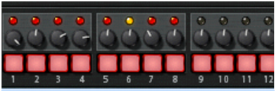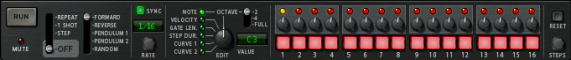 Step Sequencer Thor’s Step Sequencer is a further development of the step sequencers which were often present in vintage analog modular systems. It can be used for programming arpeggios or short melody sequences. Alternatively, it can be used purely as a modulation source. You can have up to 16 steps, and each step can be programmed with various values such as Note pitch, Velocity, Step Duration etc. Basic operation The main parameters and functions are as follows: The row of 16 buttons are used to program each step’s on or off status. A lit button means that the step is active, and a dark button means that the step will be a rest (silent). Each step button has a knob above it, which is used to set values for the corresponding step. The Edit knob determines what value you set with the step knobs. The available Edit values are Note (pitch), Velocity, Gate length, Step duration and Curve 1 and 2. The Run button starts/stops the step sequencer. What exactly happens when you press Run depends on the Run mode - see below. Setting the Run mode The Run mode is set with the lever beside the Run button. The set mode governs how the step sequencer is played back when you press Run. The options are as follows: Repeat mode - this will repeat the sequence continuously. Click the Run button again or use the Transport to stop. 1 Shot mode - this will play the sequence once then stop. Step mode - the Run button steps the sequencer forward one step at a time. Off - the step sequencer is inactive. Setting the direction The Direction parameter is used to set the direction of the step sequence. The following options are available: Forward - plays the sequence from the first step to the last. Reverse - plays the sequence from the last step to the first. Pendulum 1 - plays the sequence from the first step to the last, then from the last step to the first. I.e. the last and first step is played twice when the sequencer reverses direction. Pendulum 2 - plays the sequence from the first step to the last, then from the second last step to the first, i.e. without repeating the last/first step when reversing direction. Random - plays the steps in a random order. Programming step note pitch To program step note pitch, you proceed as follows: 1. Make sure that the Step Seq Trigger button is activated in the Controller panel. 2. Set the Run mode to “Repeat”. You don’t have to use Repeat mode but it makes it easier to follow the following steps. 3. Start the step sequencer by pressing the Run button. You should now hear a sequence of repeated notes, each with the same pitch (C3). The current step is indicated by a yellow LED above the step buttons. 4. Make sure that the Edit knob is set to Note. 5. Turn one of the step knobs above one of the steps. A tooltip shows you what current note pitch the knob is set to, and when the sequencer repeats you should be able to hear the change in pitch for that step. Turn clockwise to raise the pitch in semitone increments. Turn counter-clockwise to lower the pitch. You can set the knob’s note range by using the Octave lever to the left of the step buttons. Available note ranges are 2 Octaves (i.e. one octave up and down from the middle knob position (C3), 4 Octaves (i.e. two octaves up and down from the middle position (C3), or Full (-C2 to G8). Note that the octave range can be set independently for each step. Each step memorizes the current octave range when the pitch is set for that step, and will keep this octave range until you change the pitch for the step with a different octave range setting. You can either program steps “on the fly” (with the Step sequencer running) or step by step (Step mode). In Step mode, you press Run to forward the step number one position so you can set step parameters for one step at a time. By using this general method you can continue to enter note pitch for other steps. Inserting rests To make step sequences more rhythmically interesting, you can program rests for steps. This is simply done by pressing one or several step buttons so they go dark. Dark steps will be rests. Note that the Step Duration value still “counts” for rests. Setting the number of steps You can set how many steps a sequence should have before starting over using the Steps knob at the far right on the panel. Up to 16 steps can be used. The lit LEDs above each step button show the number of steps currently used. You can also change number of steps by clicking on a LED directly - the sequencer will then stop/start over at the selected step. Setting Rate The Rate knob determines the rate of the step sequence. • You can either use “free running” rates (i.e. not synced to main sequencer tempo) or synced tempo. This is set with the Sync button on/off status. If Sync is active you can set the tempo in various beat resolutions. Setting other values for steps For each step you can also program other parameters with the step value knobs apart from note pitch. You use the Edit knob to set one the following: Velocity - if this is selected as the Edit mode you can set a velocity value for each step. Default value is 100, range is 0-127. Gate Length - if this is selected as the Edit mode you can set a Gate Length value for each step. Default is 75%. Gate Length determines the length of the note played for that step. Step Duration - if this is selected as the Edit mode you can set a Step duration value for each step. This parameter determines the total length of the step, which is a factor related to the sequencer rate. Range is 1/4 to 4. E.g. if Rate is 1/16, “1” means a 1/16-note will be played, a “4” means a 1/4-note will be played, and so on. The Curves 1 and 2 allow you to set values for each step that can be sent to control parameters of your choice. This is done in the Modulation bus routing section, where these two independent Curves are selectable as Source controllers. You can compare these curves to the Curve CV output of the Matrix - they simply 