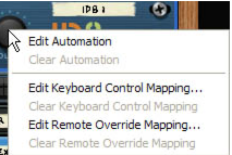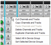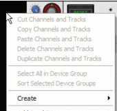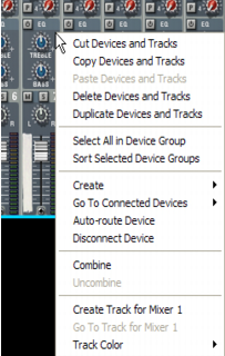 Context menus Context menus are “tailored” to contain only menu items that are relevant to the current circumstances. Using the various context menus allows you to work more quickly and more efficiently with Reason Essentials. To bring up a context menu, right-click (Win) or [Ctrl]-click (Mac) on the desired object, section or area in Reason Essentials. The Mixer 14:2 device panel context menu If you are using a Mac with a two button mouse, you may want to set this up so that clicking the right mouse button generates a [Ctrl]-click. This way, you can right-click to bring up context menus. The contents of the context menus depend on where you click. These are the primary types of context menus you will encounter in Reason Essentials: Parameter context menus If you click on an automatable control (a mixer parameter, a device parameter, a fader, etc.), the context menu will contain the following items: • Functions for editing and clearing the recorded automation data for the control. • Functions for associating computer keyboard commands and/or MIDI messages to the parameter. This allows you to remote control parameters from a MIDI device or from the computer keyboard. Device context menus If you click anywhere on a device in the Rack (but not on a parameter or display), the context menu will contain the following items: The Mixer 14:2 device panel context menu • Cut, Copy, Paste, Delete and Duplicate Device and Track items, allowing you to rearrange and manage the devices in the rack. • Commands for managing Device Groups. • A duplicate of the Create menu, allowing you to create new devices. • A “Go To” submenu, listing all devices connected to the current device. Selecting a device from the Go To submenu scrolls the rack to bring that device into view. • Auto-routing and Disconnect functions. This allows you to automatically route (connect) or disconnect a selected device in a logical way. • Combine and Uncombine are used when you want to use the selected device in, or exclude it from, a Combinator setup. • A Browse Instruments item which lets you browse for sounds for a selected Instrument device. This item is available only for Instrument devices. • Additional device-specific items. If the device is pattern-based, there will be various pattern functions (Cut/Copy/Paste, Clear, Shift, Randomize, etc.). These affect the currently selected pattern in the device. If the device uses patches, there will be functions for managing patches. Depending on the device there may also be various device-specific functions available. For example, the drum machine device has functions for manipulating the pattern for the selected drum sound only, etc. • “Create Track for...” and “Delete Track for...” are used if you want to create a Sequencer Track for the selected device, or delete the Sequencer Track used for the device without deleting the actual device. • The “Go To Track for ...” will scroll the corresponding Sequencer Track into view in the Sequencer. • The “Lock Control Surface to this Device” lets you lock a connected control surface to the selected device. • The “Track Color” item lets you select color for the associated Sequencer Track (and Main Mixer channel strip, if the selected devise is an Audio Track device). Main Mixer channel strip context menu If you click anywhere on a channel strip in the Main Mixer (but not on a parameter or display), the context menu will contain the following items: The Channel Strip context menu. • Cut, Copy, Paste, Delete and Duplicate Channels and Track items, allowing you to rearrange and manage the channel strips in the Main Mixer. • Commands for managing Device Groups. • A duplicate of the Create menu, allowing you to create new devices. • The “Create Send FX” lets you browse for an effects device, or Effect Combi patch, to connect and use as a send effect. The send effect will be automatically connected to the first available Send FX connectors of the Master Section device in the Rack. • The “Copy Channel Settings” item lets you copy groups of settings for the selected channel strip. The groups that can be selected are: “Filters and EQ”, “Insert FX”, “FX Sends” and “All”. • The “Paste Channel Settings” item appears if you have previously copied any channel settings and want to paste these to the selected channel strip. • The “Browse Insert FX Patches” lets you browse for, and load, Effect Combi patches to the Insert FX section. • The “Clear Insert FX” lets you remove any devices currently in the Insert FX area. • The “Reset Channel Settings” resets all channel strip parameters to their default values. It also automatically removes any used Insert FX devices from the channel strip. • The “Set Remote Base Channel” item lets you set the remote base channel to the selected channel strip. This is useful when you remote control channel strips from a control surface via MIDI. • The “Lock Control Surface to this Device” lets you lock a connected control surface to the selected channel strip. • The “Channel Color” item lets you select color for the Main Mixer channel strip (and the associated Sequencer Track, if the selected channel has a track in the sequencer). Rack “background” context menu If you click in an empty area of the rack, the context menu will contain the following items: • A Paste Devices and Tracks item, allowing you to paste any copied or cut devices and tracks. • A duplicate of the Create menu, allowing you to create new devices. Main Mixer “background” context menu If you click in an empty area of the Main Mixer, the context menu will contain the following items: • A duplicate of the Create menu, allowing you to create new devices. • The “Create Send FX” lets you browse for an effects device, or Effect Combi patch, to connect and use as a send effect. The send effect will be automatically connected