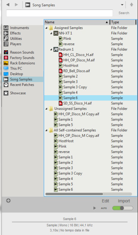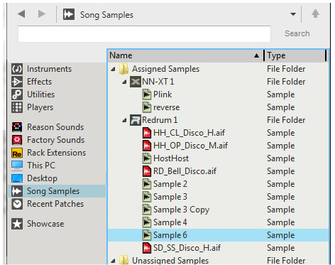 4. Here, all samples you use in your song are listed (see “The Song Samples location”). Here is also where you can open samples for editing (see “Editing samples”).Here, all samples that are assigned to devices in the song are listed. All devices that contain assigned samples are listed as “sub-folders”. Each device “sub-folder” shows the samples currently assigned to it. See “Assigned Samples” for more details.If you remove a sound you have sampled from a device, the sound is automatically moved from the Assigned Samples folder to the Unassigned Samples folder. From here you can load the sample into other devices if you like. See “Unassigned Samples” for more details.All sounds you have sampled yourself, plus any duplicated samples from the Factory Soundbank and/or ReFills, automatically becomes self-contained and are always stored with the song. These samples are listed in the All Self-contained Samples folder. See “About self-contained samples” for more details.Click the Edit button to open the selected sample for editing in the Edit Sample window (see “The Edit Sample window”).Select this to open the sample for editing in the Edit Sample window (see “The Edit Sample window”). If several samples are selected, this item is grayed out.Select this to create a duplicate of the selected sample. The duplicated sample is placed in the All Self-contained Samples and Unassigned Samples folders. Several selected samples can be duplicated in one go. See “Duplicating samples” for more details.Select this to export the selected sample to disk. A dialog appears where you can select file format. Note that it is not possible to export samples from the Factory Soundbank or from ReFills. Several selected samples can be exported in one go. See “Exporting samples” for more details.Select this to permanently delete the selected sample(s) from the song. Note that samples from the Factory Soundbank and from ReFills will not be deleted from their original locations - only from the song document. Several selected samples can be deleted in one go. See “Deleting samples from a song” for more details. Any samples you have recorded yourself will be permanently erased unless you have previously exported them to disk (see “Export Sample(s)” below).