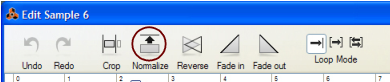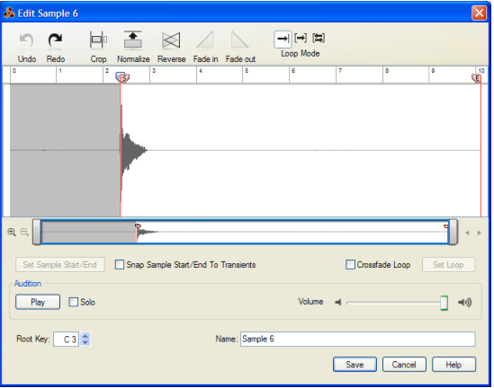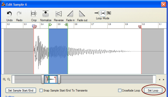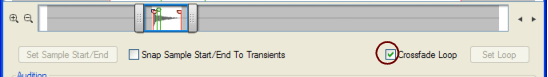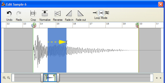 Click the Crop button to crop the sample so that only the content between the Start (S) and End (E) locators is preserved. The rest of the sample will be permanently deleted. See “Cropping samples” for more info.Click the Normalize button to amplify the entire sample so that the loudest peak touches 0 dB. Note that the entire sample is normalized, regardless of any locator settings. See “Normalizing samples” for more info.Click the Reverse button to reverse (play backward) the entire sample. Note that the entire sample is reversed, regardless of any locator settings. See “Reversing samples” for more info.The Fade In and Fade Out buttons can be used to apply a fade in or fade out of the sample volume. See “Fading in/out samples” for more info.Click one of the Loop Mode buttons to select loop type. The default (leftmost) setting is “no loop”. Then follow “Loop Forward” and “Loop Forward + Backward”. See “Looping samples” for more info.Below the waveform pane is the horizontal Waveform Navigator. This can be operated in the same way as the Song Navigator in the sequencer (see “Scrolling with the Navigators and scrollbars”, “Zooming horizontally in the Sequencer” and “Scrolling and zooming using a wheel mouse”).Set the desired sample playback region by clicking and dragging on the waveform pane. Then, click the Set Sample Start/End button to automatically place the Start and End locators at the beginning and end of the sample region. See “The Set Start/End function” for more info.Tick the Crossfade Loop box to introduce a crossfade in the loop. Crossfade is useful to even out any clicks in the loop points, especially for sounds with fairly even volume throughout the loop region. See “The Crossfade Loop function” for more info.Set the desired loop region by clicking and dragging on the waveform pane. Then, click the Set Loop button to automatically place the Left and Right Loop locators at the beginning and end of the loop region. See “The Set Loop function” for more info.