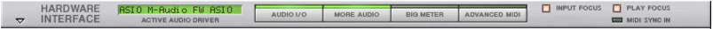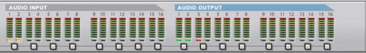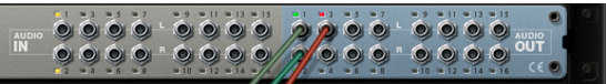 However, the number of available inputs and outputs depends on the number of inputs and outputs on your hardware audio interface. For example, if you are using a standard sound card with stereo inputs and outputs, only the first two inputs and outputs will be available. In the Hardware Interface, the indicators are lit green for all currently active and connected inputs and outputs. Activation of inputs and outputs on your hardware audio interface is done on the Audio page in the Preferences dialog (see “Active input and output channels”).In most cases, you will want to have the Main Mixer Master Section device connected to outputs 1 and 2 of the Hardware Interface. This connection is made automatically as soon as you create a new Song document. However, there might be situations where you want to manually route audio to other outputs of the Hardware Interface. For example if you want to use the Control Room Outputs of the Main Mixer (see “Control Room output section”).To send the sound of a device in the Rack to a specific output, you route the device output to the corresponding Output jack on the Hardware Interface. This is done by using the patch cables on the back of the rack, as described in “Manual routing”. If we flip the rack around, by pressing the [Tab] key, the Hardware Interface looks like this: