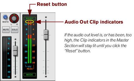 In some situations, the Audio Out Clip indicator on the Transport Panel and the Output Clip indicators on the Reason Hardware Interface might light up if the metronome Click is active in the sequencer during playback (see “Click and Pre-count”). This is nothing to worry about and won’t cause any distortion in your song. To determine if the metronome is causing the clipping indication, just disable Click and see if the clipping stops.
