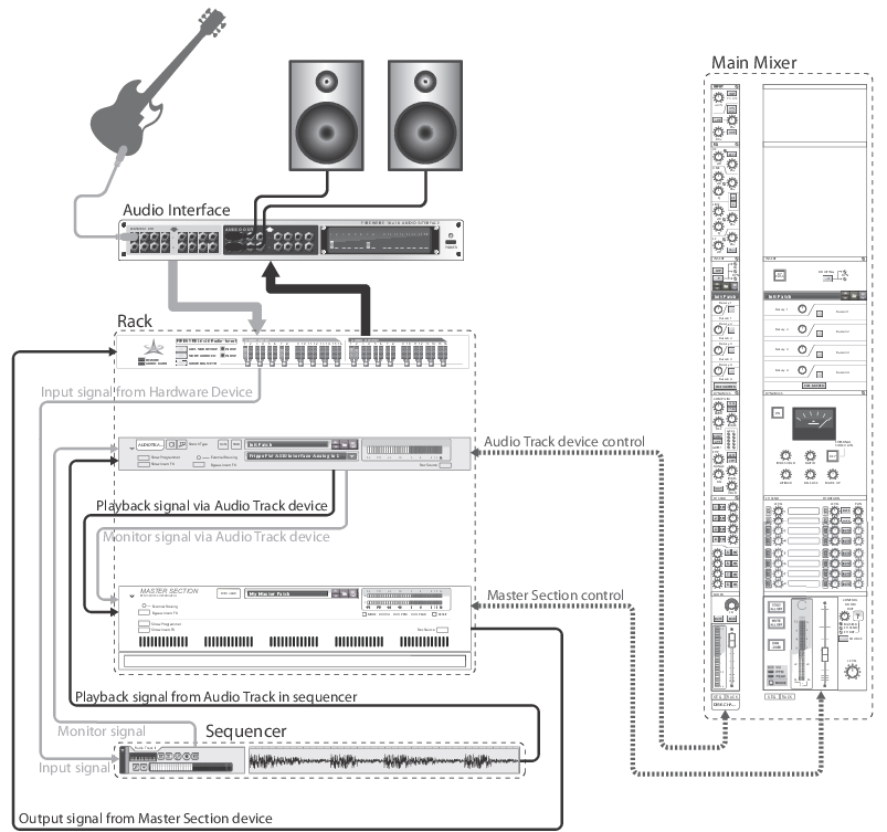 When you’re recording and playing back audio that originates from an external source, like a guitar or a vocalist, the audio signal must first travel from the source, via a hardware audio interface, into the Reason application. Then, when played back, the audio travels from the Reason application, via the hardware audio interface, to a speaker system or similar. The figure below shows a schematic overview of the audio signal paths for a “standard” auto-routed Audio Track in Reason:
