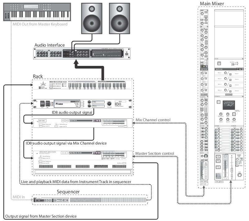When you’re recording and playing back audio from an instrument device, like the ID8 Instrument device, the audio signal only has to travel only in one direction: from the Instrument device, via the hardware audio interface, to a speaker system or similar. The figure below shows a schematic overview of the audio signal paths for an auto-routed Instrument Track in Reason: