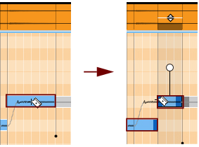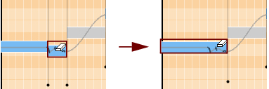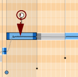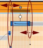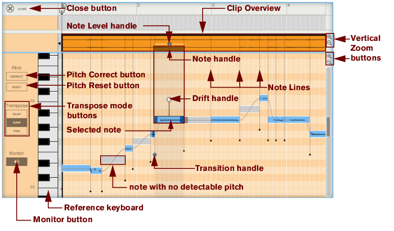 Hold this and move sideways to move the note back or forth in time. The range is limited by the adjacent notes, which are indicated by the Note Lines, see “Moving notes and changing note lengths”.These indicate where the notes start and end. You can adjust the start/end positions by click-holding a Note Line and dragging it sideways. Changing the position(s) and/or length(s) will also automatically stretch the note(s). See “Moving notes and changing note lengths”.The Drift handle appears when you select the note(s). Drag the Drift handle downwards to reduce the amount of any natural pitch drift/vibrato present in the selected note(s), see “Attenuating pitch drift/vibrato”.The Transition handle(s) control the pitch transition times between the selected note(s) and the previous adjacent note(s), see “Editing transition times”.This is a three-way switch that determines what happens when you drag notes up/down on the note pane: