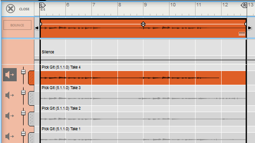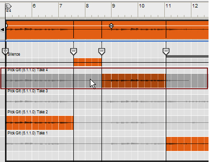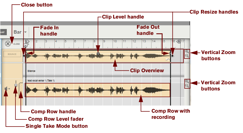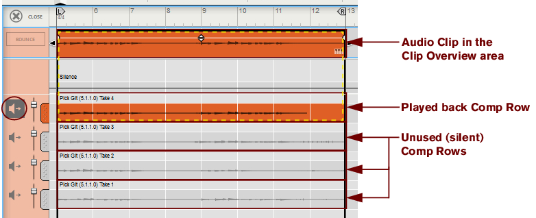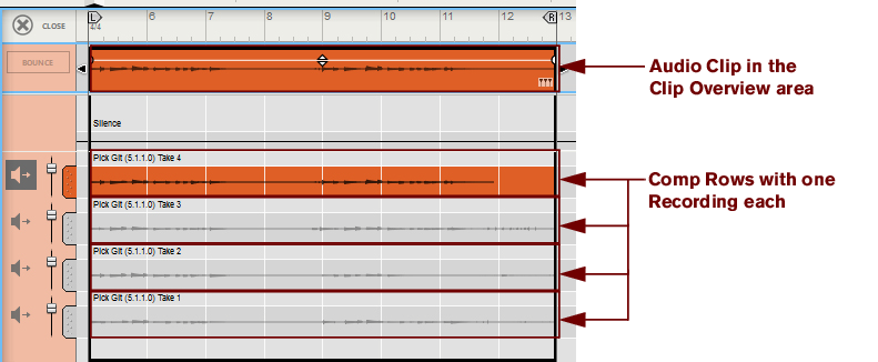 • Depending on how you recorded the audio clip, there can be one or several Comp Rows, containing one audio recording each. Comp Rows can be described as “virtual tracks” in the sense that you can have many parallel Comp Rows in an audio clip but only play back from one Comp Row at a time (see “Creating a comped audio clip”). In Single Take clips, only the audio recording on the currently selected Comp Row will play back.A Comp clip consists of several Comp Rows, with one recording on each Comp Row. If you have recorded several takes in an audio clip and want to cut out sections of the various takes and comp into a final clip, this can be done in the Comp Editor (see “Creating a comped audio clip”). This is how an already comped audio clip could look like in Comp Edit mode: