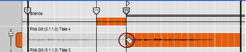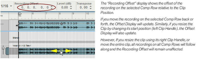 Duplicating Comp Rows can be useful if you want to re-use the same part of a take several times in a comped clip. Duplicate the Comp Row and then adjust the Recording Offset (see “Adjusting the Recording Offset”) in the duplicated Comp Row to access the same part of the recording in another segment of the comped clip. Duplicating Comp Rows will not use up any more space on your hard disk, so you can do this as many times as you like.