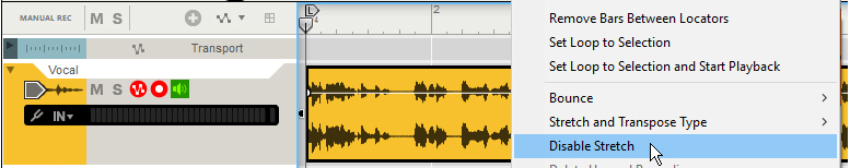 Audio and tempo matching Matching imported audio to the song tempo Audio files created by the Export or Bounce functions in Reason include information about their original tempo. When you import such an audio file, it will automatically be stretched to fit the tempo in the new song. However, if you have imported audio which has a steady, but unknown, tempo, you can adjust the imported clip to the song tempo. You can either use the Clip Tempo Scaling function to manually “stretch” the audio clip as described in “Tempo scaling Clips”. Another way is to disable the automatic stretch for the audio clip and then adjust the sequencer tempo to match the clip. This is done in two steps: first you adjust the song tempo to the imported audio clip without Stretch enabled and then adjust the song tempo back to original - with Stretch enabled on the audio clip: 1. Select the clip containing the imported audio file and choose “Disable Stretch” from the Edit menu or context menu. Disabling Stretch makes the audio recording in the clip play back at the same tempo regardless of song tempo in the sequencer. Disabling Stretch on a clip containing an imported audio recording. 2. Start the sequencer and adjust the sequencer Tempo, up or down, to match the tempo of the audio recording in the clip. If necessary, enable the metronome click in the sequencer to get an audible tempo reference. Continue adjusting the tempo of the song until it matches the tempo of the audio recording. 3. Adjust the length of the clip so that it plays the entire audio file (or as much as you want). 4. Select the clip and select "Bounce > Bounce Clip to New Recording" from the Edit menu or context menu. The new recording will sound the same, but include information about the tempo you set in step 2. 5. With the audio clip still selected, choose “Enable Stretch” from the Edit menu or context menu. 6. Adjust the song tempo back to the original BPM. As you adjust the song tempo, the tempo of the audio recording will follow along accordingly - without affecting the original pitch of the recording. This is done by stretching the audio. Reason does this automatically in two parallel steps: a real-time “preview” stretch so that you can instantly hear the result of your tempo changes, then a high quality stretch “in the background” to further improve the sonic results. As soon as high quality stretch is in progress, the “Calc” indicator on the Transport Panel shows a progress meter: The CALC progress meter appears when Reason performs high quality stretching of audio. Since the high quality stretch is performed in the background, you can still continue to work with your song without any interruption. When the high quality stretch data has been calculated, the Calc indicator goes out and the high quality audio data will be heard on playback.
