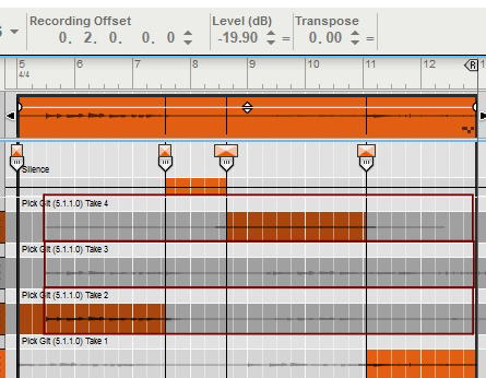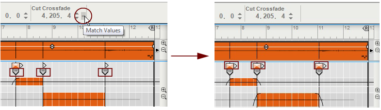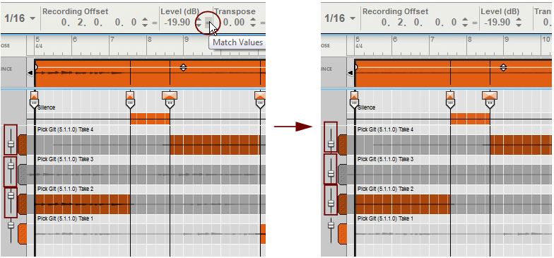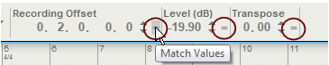 Editing audio using the Inspector The Inspector can be used for editing audio recordings numerically. For Inspector editing specific to Pitch Edit mode, please refer to “Audio pitch editing in the Inspector”. Editing recordings and cuts in the Inspector If you select a Comp Row, the three displays change to show the Recording Offset, Comp Row Level and Comp Row Transpose value: If you select a Cut Handle in Comp Mode, two displays appear, showing the Cut Handle’s Position and Crossfade time: Edit the values by clicking on a segment in a display and then dragging up/down, using the up/down spin controls, or typing in new values. Snap is not taken into account. See “Inspector segment displays” for details on how to edit in the Inspector displays. Editing multiple recordings or multiple cuts in the Inspector When you edit values for several selected Comp Rows or objects (Cut Handles etc.), the changes will always be relative. For example, if you change the Recording Offset, Level or Transpose values when several Comp Rows are selected, the recordings will all be changed by the same amount; their relative values will be retained. • If several Comp Rows are selected, the displays will show the values for the topmost selected Comp Row. • If several Cut Handles are selected, the displays will show the Position and Crossfade values for earliest Cut Handle in the clip. • If several Comp Rows, or several Cut Handles, are selected and any of their values differ, Match Value buttons appear next to the corresponding display. For Cut Handles, only Crossfade values can be matched - not the Positions. See “Matching audio values using the "Match Values" function”. • If Comp Rows and Cut Handles are selected in combination (e.g. for moving Cuts and recordings together as a group), no displays are shown in the Inspector. Matching audio values using the "Match Values" function The Match Values buttons appear as ‘=’ signs. The “Match Values” function in the Inspector can be used for matching Recording Offsets, Comp Row Levels and Transpose values of several selected Comp Rows to the offset/level/value of the topmost selected Comp Row. It can also be used for matching Cut Crossfade values of several selected Cut Handles to the Crossfade value of the Cut Handle with the earliest start position in the clip. The “Match Values” function can also be used for matching the following parameters of several selected notes in Pitch Edit mode: Note, Fine-tune, Drift, Preserve Expression, Transition, Formant and Level. See “Audio pitch editing in the Inspector” for more info. Matching Recording Offsets Matching Recording Offsets is useful if you want to make sure that the Recordings on multiple Comp Rows start at the exact same position. 1. Select more than one Comp Row and then place the Selection Tool on the Recording Offset Match Value button. Three selected Comp Rows (the three topmost). The topmost Comp Row has the Recording Offset set to 2 beats. 2. Click the Match Value button to the right of the “Recording Offset” display. The Recording Offsets on all selected Comp Rows have now been moved to 2 beats. The Recording Offsets of the recordings on the three topmost Comp Rows have been moved to 2 beats. Matching Comp Row Levels Here’s an example showing how to match Comp Row Levels: Select several Comp Rows and then click the Level Match Value button. The Levels on the three selected Comp Rows are matched and adjusted to -19.90 dB. Matching Comp Row Transpose values Select several Comp Rows and then click the Transpose Match Value button. The transposition is matched to the Transpose value of the topmost selected Comp Row. Matching Cut Crossfades Matching Cut Crossfades is a time-saving function if you want to apply the same Crossfade times to several Cuts throughout the clip. If you want to eliminate any clicks between segments in your comped clip, you could apply a Cut Crossfade to the first Cut and then match the other Cuts to get the same Crossfade times in one go: Select several Cut Handles and click the Cut Crossfade Match Value button. The Crossfades of the selected Cuts are matched and adjusted to the Crossfade times of the earliest selected Cut.