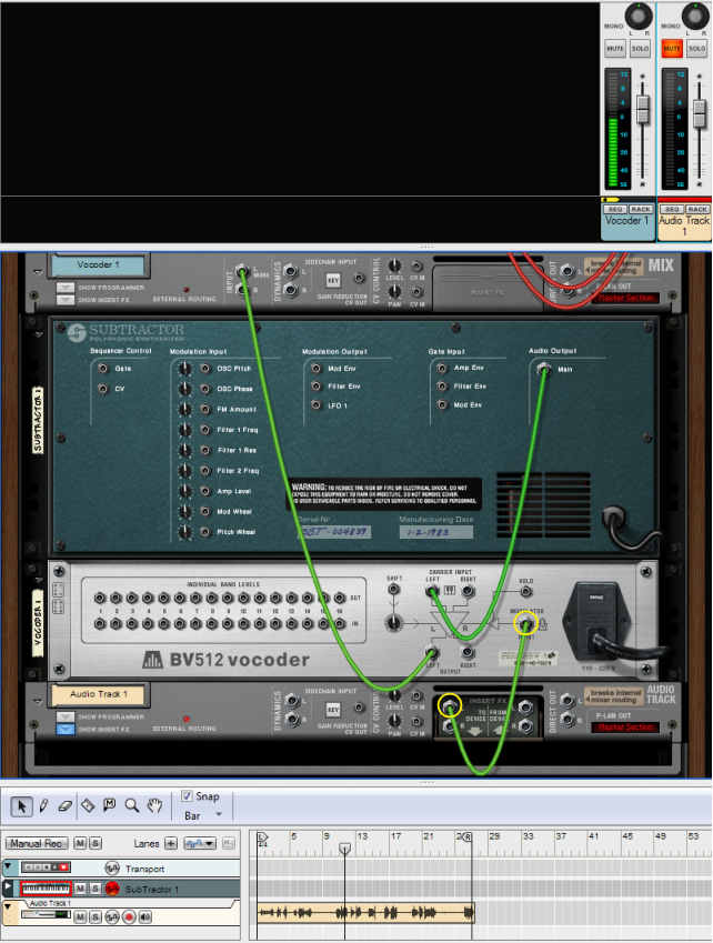 This tutorial describes how to connect and use a typical vocoder setup. We assume here that you have a MIDI keyboard connected. For details on the parameters, see “BV512 parameters”.It’s important to have high frequencies (a lot of harmonics) in the carrier. On the Subtractor, a simple but effective carrier sound would be based on a sawtooth wave, with the filter fairly open. For more about choosing carrier sounds, see “Choosing a carrier sound”.See “BV512 parameters” for details.Refer to “Recording audio from Mix Channel outputs” for more details on how to record Mix Channel outputs.