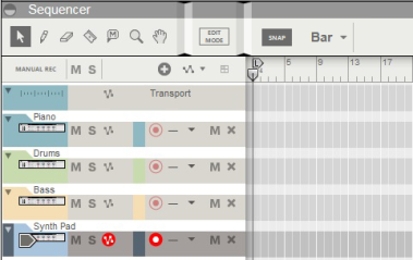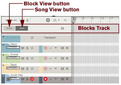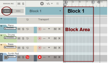 A colored area appears on the arrangement pane with the Block name at the top on the Blocks Track. By default, the Blocks are named “Block n” where “n” is a number between 1 and 32. If you like, you can rename your Blocks to more suitable names (see “Renaming Blocks”). The Block View is where you record the clips you want to include in a specific Block. The clips present in the colored Block area in the Block View are unique only to that specific Block.