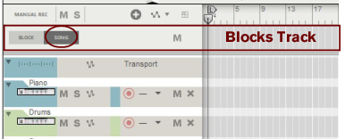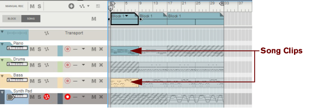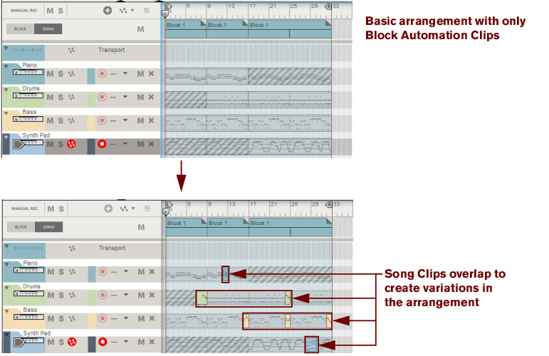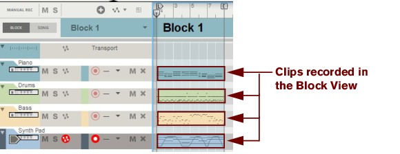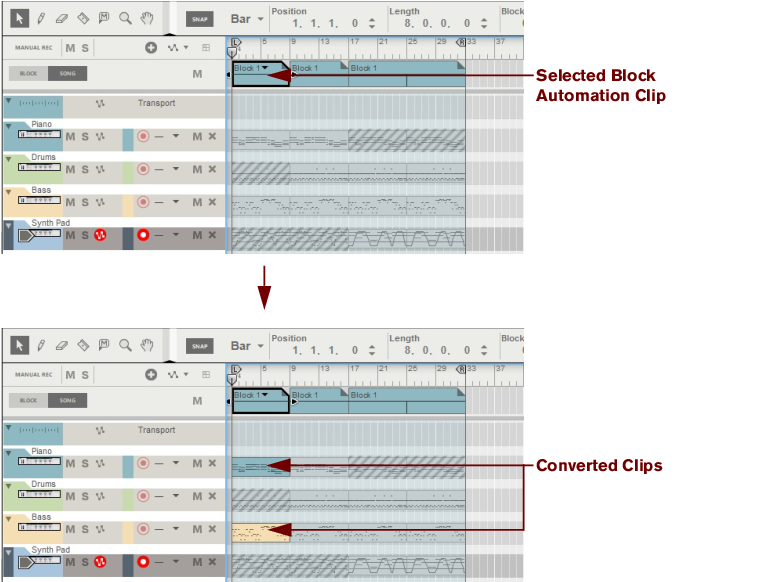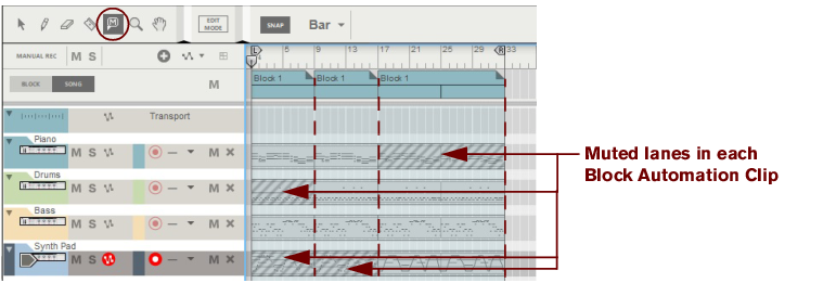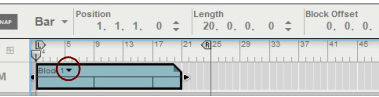 The following section describes functions and routines that are specific to Block Automation Clips. General clip handling procedures (e.g. naming, coloring etc.) are described in the general “Clip handling” section.The contents (clips and events) of Block 1 are displayed on the respective sequencer tracks in a ghosted fashion on a colored background. This way you will see what events and/or recordings the Block will play back. This also allows for muting of individual lanes in the Block (see “Muting lanes in Block Automation Clips”).