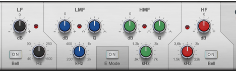 Panel reference Global controls Gain Adjust the Channel EQ gain with this knob. This is useful for level-compensating when doing drastic boosts or cuts. Range: +/- 18.00 dB The signal level is shown in the meter. The Filter section The Filter section contains a 12 dB/octave low pass filter and an 18 dB/octave high pass filter. The parameters are as follows: HPF On Click the On button to activate the high pass filter. HPF Freq The High Pass filter (HPF) removes low frequencies from the signal, resulting in a thinner sound. The HP filter slope has a 18 dB/Octave roll-off. Set the desired cutoff frequency for the high pass filter. Range: 20 Hz - 4 kHz LPF On Click the On button to activate the low pass filter. LPF Freq The Low Pass filter (LPF) removes high frequencies from the signal, making the sound less bright. The LP filter has 12 dB/Octave roll-off curve. Set the desired cutoff frequency for the low pass filter. Range: 100 Hz - 20 kHz. The Equalizer section The Equalizer section features a four-band EQ with parametric midrange controls and high and low frequency shelving bands. The EQ can be switched between two operating modes, each with slightly different curve characteristics. The Equalizer has the following parameters: LF Gain The LF section provides low frequency shelving equalization. All frequencies below the set LF Frequency will be cut or boosted by the set LF Gain amount. Set the LF Gain/Attenuation amount. Range: +/- 20 dB LF Frequency Set the LF Frequency. Range: 40 Hz - 600 Hz LF Bell Click the LF Bell button to switch the LF EQ to peaking characteristics. This means it works like a regular parametric EQ band, cutting or boosting the signal around the set LF Frequency. Bell mode has a fixed bandwidth or "Q" value. LMF Gain The low medium frequency EQ is fully parametric. Set the LMF Gain/Attenuation amount. Range: +/- 20 dB LMF Frequency Set the LMF (center) Frequency. Range: 200 Hz - 2 kHz LMF Q The “Q” parameter adjusts the bandwidth around the set center LMF Frequency. The higher the Q value, the narrower the affected frequency range - except in “E” mode (see “E Mode”). Set the Q value for the LMF EQ. Range: 0.70 - 2.50 E Mode Click to switch to E Mode. When the E Mode button is activated the EQ will have slightly different curve characteristics. In normal mode (E button deactivated), the Gain setting will also affect the bandwidth (Q value) for the LMF and HMF EQs. The higher the Gain, the narrower the bandwidth and vice versa. With E Mode activated, the bandwidth is constant at all Gain settings. HMF Gain The high medium frequency EQ is fully parametric. Set the LMF Gain/Attenuation amount. Range: +/- 20 dB HMF Frequency Set the HMF (center) Frequency. Range: 600 Hz - 7 kHz HMF Q The “Q” parameter adjusts the bandwidth around the set center HMF Frequency. The higher the Q value, the narrower the affected frequency range - except in “E” mode (see “E Mode”). Set the Q value for the LMF EQ. Range: 0.70 - 2.50 HF Gain The HF section provides high frequency shelving equalization. Frequencies above the set corner Frequency will be cut or boosted by the set HF Gain amount. Set the HF Gain/Attenuation amount. Range: +/- 20 dB HF Frequency Set the HF Frequency. Range: 1.5 kHz - 22 kHz HF Bell Click the HF Bell button to switch the HF EQ to peaking characteristics. This means it works like a regular parametric EQ band, cutting or boosting the signal around the set HF Frequency. Bell mode has a fixed bandwidth or "Q" value.