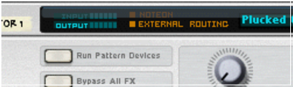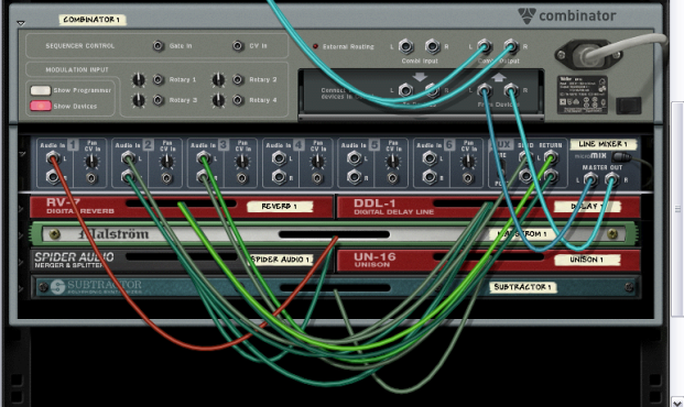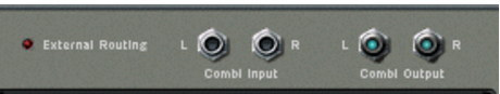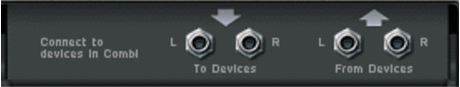 About internal and external connections Unlike other devices, the Combinator contains both external and internal audio connections. External connections are used to connect a Combinator to devices outside the Combi. Internal connections are how devices within the Combi are connected. External connections The “Combi Output L/R” connectors carry the audio output of the Combinator. This output connects with a device outside the Combi, normally a mixer. Internally, this output is connected to the “From Devices” connectors. When you create a new Combinator this output will be auto-routed to the first available mixer input channel. The “Combi Input L/R” connectors is the input to the Combinator (used for effect Combis only). Internally, this input is connected to the “To Devices” connectors. Internal Connections The “From Devices L/R” inputs is where the outputs from devices in the Combi are connected. The “To Devices L/R” outputs connect to an input on a device in the effect Combi. About External Routing If an individual device in the Combi is directly connected to a device outside the Combinator, this is known as an “External Routing” connection, which should generally be avoided. The reason for this is that such connections are not saved with the Combi patch. Therefore, all connections to/from a Combi should pass via the To/From Device connectors on the Combinator device if you wish to make the Combi self-contained. If a Combi contains external routing connections, this is indicated both on the front and back panels of the Combinator; On the front panel “External Routing” is displayed in the Patch name display, and on the back panel a LED indicator is lit. It is still possible to use a Combi with External Routing connections within the context of a song (where all routings are saved with the song). Just keep in mind that the external routing connections will not be part of the patch! How to avoid external routing connections As explained previously, all connections to/from a Combinator device should pass via the To/From Device connectors in order to make the Combi self-contained. Therefore you need to include a mixer device for Combis with more than 2 device outputs. Say you were to combine three instrument devices (each with stereo outputs connected to a mixer) in order to create a layered or split instrument Combi. If you simply selected these three instrument devices (but not the mixer) and then selected “Combine”, only one of the devices would be auto-routed to the “From Devices” connectors, while the other two devices would have the same connections they had before combining. Therefore: When combining several instrument devices, connect them to a mixer device and include this mixer in the Combi. This way, all the instrument device outputs in the Combi can be connected to separate input channels in the mixer. The mixer device output can then be routed via the “From Devices” connectors and thus the Combi will be self-contained. Instrument devices and effects connected to a Line Mixer 6:2 within the Combi. The Line Mixer 6:2 is ideally suited for mixing device outputs in Combis (see “The Line Mixer 6:2”).