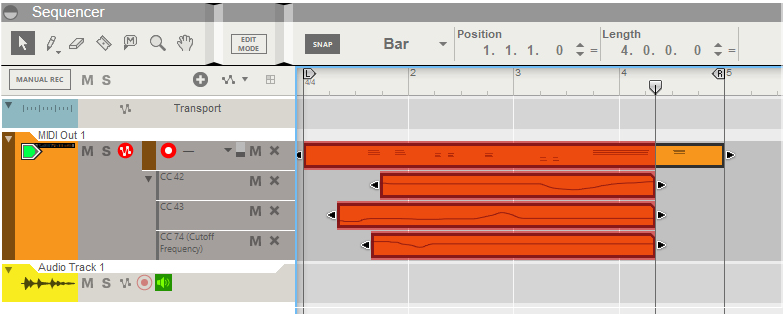 Using the MIDI Out Device Setting up for controlling an external MIDI instrument To be able to control external MIDI instruments from Reason it is required that you have installed a MIDI interface on your computer. Refer to the documentation of your specific MIDI interface for installation instructions. 1. Connect your external MIDI instrument to the MIDI interface on your computer: MIDI Interface MIDI Out to MIDI instrument's MIDI In. If you want to play and/or record MIDI from your MIDI instrument to Reason, connect your instrument’s MIDI Out to your computer’s MIDI In as well, see “Recording MIDI Controller automation from the controlled MIDI instrument”. If you are using the same MIDI instrument also as MIDI Master Keyboard for Reason, you will need to set it to “MIDI Local Off”. Otherwise you will get doubled notes when you play your MIDI instrument. To be able to hear your external MIDI instrument in Reason, connect your instrument’s audio output(s) to the desired audio input(s) of your audio interface. Then, create an Audio Track, select the appropriate audio inputs and make sure the Monitor button on the Audio Track in the sequencer is on. 2. Create a MIDI Out Device from the “Instruments >” sub-menu in the Create menu or from the Instruments palette in the Browser. The device is created in the rack and a track is automatically created in the sequencer. Make sure that the MIDI instrument controlled by the MIDI Out Device device does NOT transmit the MIDI data back to Reason (e.g. via “MIDI soft through” or “MIDI throughput”). This could cause MIDI feedback loops that could result in MIDI overflow in Reason. Refer to the user manuals for your MIDI instruments for information on how to set the instruments to MIDI Local Off and how to prevent MIDI feedback loops. 3. Select the desired MIDI Port from the drop-down list to the right of the display. All MIDI Ports that are currently available for Reason on your computer are displayed in the list. 4. Click the up/down MIDI Channel arrow buttons to select the MIDI Channel your external MIDI instrument is set to receive on. The selected MIDI Channel number is shown in the display. 5. Select the MIDI Out Device track in the sequencer. Now, you should be able to play your external MIDI instrument from your Master Keyboard. If you get problems with “hanging” notes, press [!] to send out an “All Notes Off” command on the MIDI port. The “MIDI: Send All Notes OFF” command can also be found in the Options menu. Controlling the sound of your external MIDI instrument Besides the keyboard note control, you can also control the sound of your external MIDI instrument by using the Pitch (bend) and Mod (wheel) controls, as well as Keyboard Velocity and Aftertouch. How your sound responds to these controls is totally dependent on how the sound was programmed in your external instrument. For example, Pitch Bend range, Mod Wheel modulation destination, Velocity and Aftertouch modulation need to be defined on your external MIDI instrument. Using MIDI Program Change The Program Change MIDI message is used for selecting the desired sound/program/preset on MIDI instruments that have memory locations for stored sounds. The MIDI Out Device has a dedicated control for this, the Program control. 1. Click the On button to activate the MIDI Program Change function. 2. Click the up/down arrow buttons to select the Program number that corresponds to the sound you want to recall on your external MIDI instrument. As soon as you load your Reason song, the MIDI Out Device will automatically send out the selected MIDI Program Change message on the set MIDI Port. This ensures that your connected instrument will play the correct sound/program/preset. Automating MIDI Program Change If you like, you can automate the Program parameter to change sound/program/preset of your external instrument during playback of your Reason song. 1. Right-click the Program up/down buttons, or the display, and select “Edit Automation”. This creates a separate Program Change automation lane in the sequencer track. 2. Now, you can edit the Program Change lane in the sequencer and insert Program Change automation points wherever you like in your song. It’s recommended to place the Program Change automation points slightly before the positions where you want the new sound/program/preset to appear in your song. This is to allow for the time it takes to load the new sound in your external instrument. A note about MIDI Bank Select The MIDI Bank Select message is used for selecting specific banks of sounds/programs/presets in MIDI instruments that feature several sound banks. There is no specific panel control for MIDI Bank Select in the MIDI Out Device. However, you can use the regular MIDI Controller automation described below for inserting Bank Select automation points. MIDI Bank Select normally uses MIDI CC #0 and/or #32. Refer to the MIDI documentation of your specific instrument for details. Note that MIDI instruments that have several banks of sounds usually expect a Bank Select message to be immediately followed by a Program Change message in order to change the bank and program/preset. In these situations, sending only a Bank Select message - without a subsequent Program Change message - will not change anything. Note that Reason only sends out MIDI CC data when they actually change. This means that you might have to send a different “temporary” MIDI CC value just before you send the actual MIDI CC value. For example, if you want to resend the value “1” for MIDI CC#32, first send another value (e.g. “0” or “2”) and then send the value “1” immediately afterwards. You can do this by adding and/or moving automation points in the automation clip for MIDI CC#32 in the sequencer, see “Editing parameter automation”. Recording MIDI Controller automation Besides automation of the panel controls, the MIDI Out Device allows you to record 