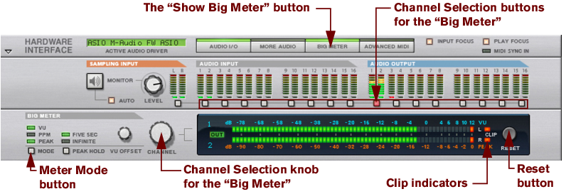 • If the audio level for the selected is, or have been, too high, the Clip indicators on the Big Meter will stay lit until you click the “Reset” button, or select new audio channels for the Big Meter. See “About audio levels” for more information on how to use and work with the Big Meter.
