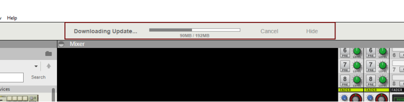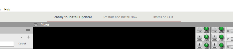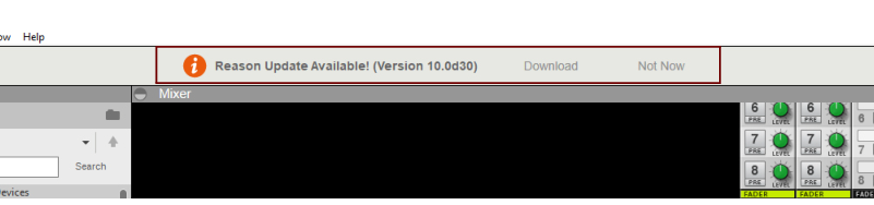 About automatic program updates As from Version 8.2, Reason supports automatic program updates (within each major release). When you launch Reason it automatically checks for new updates on the Reason Studios web site - provided your computer is connected to the Internet. If you are working with Reason off-line, and then connect to the Internet, you can manually check for updates by selecting the “Check for Updates...” item on the Help menu. Note that the automatic program update function only works within each major Reason release version, i.e. there will be no automatic update between Reason 9.x and 10.x. Each time a new Reason version is available, an “update bar” appears at the top of the Reason song document after launch. In the update bar you can choose to either download the update now or later: If you click “Not Now” Reason will wait a number of days before it checks for updates again. If you click “Download” the update is downloaded and prepared for installation. A download progress bar appears in the update bar: If you want to abort the download, click “Cancel”. If you want to hide the download progress bar, click “Hide”. When the download is ready, two options are available: Click “Restart and Install Now” to install the update and launch the updated version of Reason. Click “Install on Quit” to continue running the current Reason version and install the update after you quit the current Reason session.