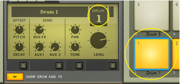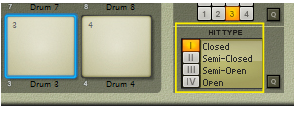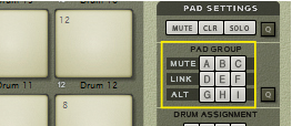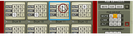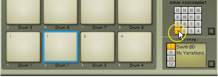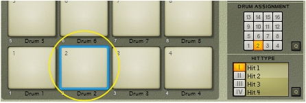 Kong features 16 pads and 16 Drum channels, as described earlier. Each pad can control a separate Drum sound channel. You can also assign several pads to control a single Drum sound channel. This is especially useful if you want to apply different settings, like Hit Types (see “Assigning Hit Type to Pads”), for each pad so that the controlled Drum sound channel responds differently. By default the 16 pads are assigned to their corresponding Drum sound channel; Pad 1 to Drum 1 and so on. If you want to change this assignment, proceed as follows: