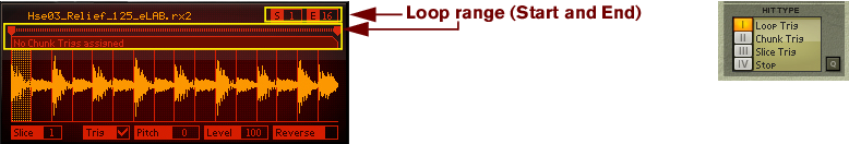 • The Nurse Rex can load standard REX files and play back the loops and/or slices in a variety of ways depending on the selected Hit Type (see “Assigning Hit Type to Pads”).In Loop Trig mode, you trig the REX loop to play one single cycle every time you hit the assigned pad. Loop Trig can also be used together with the “Stop” mode on another pad to immediately stop the loop playback, see “Stop” below.In Chunk Trig mode, you can assign several pads to play back shorter sections - chunks - of the REX loop. The number of chunks is determined by the number of pads you have assigned to the REX loop using the Chunk Trig Hit Type. The chunks are distributed in equal sections across the REX loop. Chunk Trig can also be used together with the “Stop” mode on another pad to immediately stop the chunk playback, see “Stop” below.
