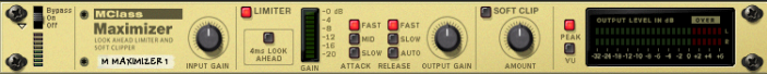 The MClass Maximizer This is a loudness maximizer, a special type of limiter which can significantly raise the perceived loudness of a mix without risk of hard clipping distortion. Features include a 4 ms look ahead function for “brick wall” limiting and a Soft Clip function. The MClass Maximizer should be used as an insert effect, and is designed to be placed at the end of the signal chain between the mixed final output and the Hardware Interface. Parameters | Parameter | Description Input Gain The Input Gain sets the basic volume of a mix. If this is set very high, you should use Look Ahead mode or the Soft Clip function to eliminate the risk of hard clipping distortion. Range: ±12 dB. Limiter On/Off This turns the Limiter section on or off. Look Ahead On/Off If activated, this will introduce a very short delay (4 ms) to the signal. This delay is used to detect peaks in the signal before they actually occur. If high peaks are detected the limiter is “ready for them” and gain reduction is applied to transparently control the peaks. Attack (Fast/Mid/Slow) This governs how quickly the Limiter will apply its effect. If set to Fast with Look Ahead activated (and the Output Gain is set to 0 dB) you will get “brick wall” limiting - no signal peaks over 0 dB will pass. Release (Fast/Slow/Auto) This determines how long it takes before the Limiter lets the sound through unaffected. If Auto is activated, the Release time will automatically adapt to the program material. Output Gain This controls the output gain and should normally be set to 0 dB. Soft Clip On/Off If this is activated, it also acts a 0 dB brick wall limiter but in a slightly different way. The signal will be “soft-clipped” which adds a pleasant, warm sounding distortion to the signal. It can be used simply to get this effect, or as a safeguard against hard clipping distortion if Look Ahead with Mid or Slow attack settings are used (or if Look Ahead is deactivated). Soft Clip Amount This controls the amount of soft-clipping distortion. Note that if Soft Clip is on but the Amount is set to zero, the distortion will be like hard clipping, and thus less pleasing to the ear. Output level meter (Peak/VU) This is a more detailed meter than found on the mixer. You can switch the meter characteristics between Peak (faster response to peaks) and VU mode (average levels).