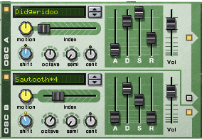 The two oscillators (osc:A and osc:B) of the Malström are the actual sound generators, and the rest of the controls are used for modulating and shaping the sound. The oscillators actually do two things; they play a graintable and generate the pitch: