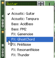 The graintables are sorted alphabetically into a number of descriptive categories, giving a hint as to the general character of the sound. Note that the categories are only visible in the pop-up menu, not in the display.