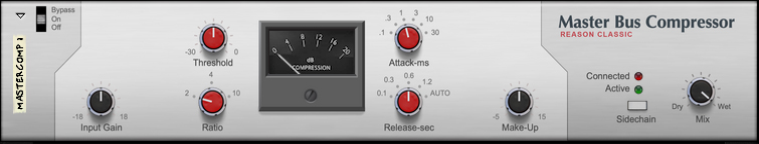Master Bus Compressor Introduction The Master Bus Compressor is the rack version of the Master Bus Compressor in Reason’s Main Mixer. The rack version is mainly intended for use in the VST3 plugin version of Reason, since it lacks the Main Mixer. However, you can of course use it wherever you like - also in the stand-alone Reason program. The Master Compressor is perfect for providing the final “fairy dust” to your mix. It can add punch and cohesion, and generally make the mix sound bigger and more powerful. It’s perfect for use on a drum channel or in a mixer bus. The compressor is very straightforward in operation and features make-up gain as well as program-adaptive Release. The Master Bus Compressor device has identical specifications compared to the Master Section version, with the addition of Input Gain and Dry/Wet Mix controls.