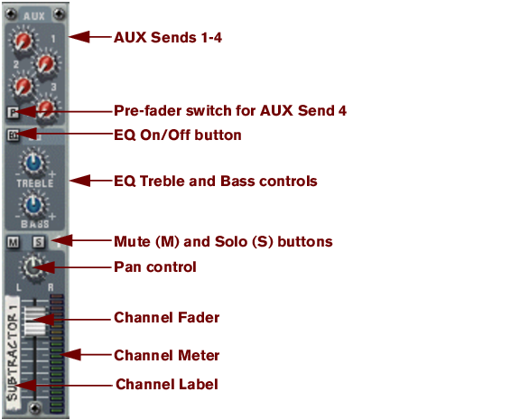 The four independent AUX Sends control the amount of channel signal that is to be sent to other devices - typically effect processors. The effect output is then normally returned to the Mixer via the AUX Return inputs (see “The Auxiliary Return Section”) where it is mixed with the dry (non-processed) signal. If you create an effect device when the Mixer is selected, the effect is auto-routed to the first available Send/Return connectors. You can then control the amount of effect that is to be applied to any device connected to a Mixer channel via the corresponding AUX Send knob. The AUX Send outputs are taken post channel fader, but you have the option of selecting Pre-fader mode for AUX Send 4 (by clicking the “P” button next to the send so that it lights up). In that mode, the send level is independent of the channel fader.