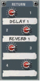The Auxiliary Returns provide an “extra” four stereo inputs in addition to the Mixer 14:2’s 14 stereo channels. The main function of Return channels is to provide inputs for connected Send effects devices. Each Aux Return channel has a level control, and a read-only tape label that display the name of the device connected to the Return channel.