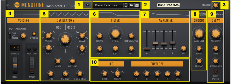 Panel overview The Monotone front panel contains the following sections: The Monotone front panel sections. • 1. MIDI Note On LED. • 2. Patch Selector (for browsing, loading and saving patches). • 3. Master Volume. • 4. Voicing section and global controls. • 5. Oscillator section. • 6. Filter section. • 7. Amplitude Envelope. • 8. Chorus section. • 9. Delay section. • 10. Modulation section.