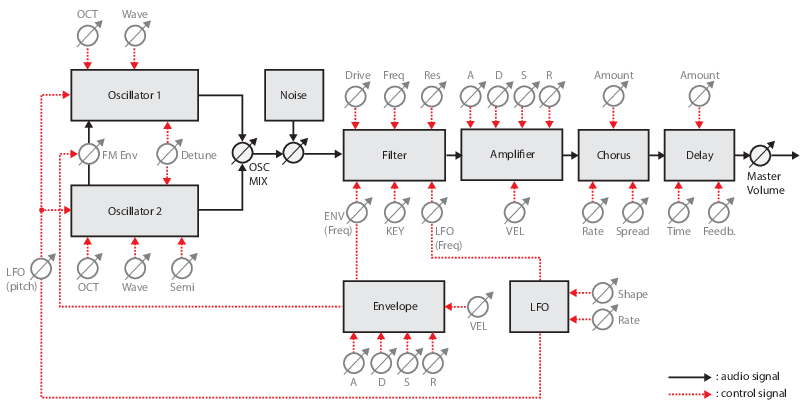 There are two oscillators in Monotone, that can produce a number of traditional “analog” waveforms - plus a Noise generator, which produces white noise. The two oscillators can be detuned, to create a fatter sound. Oscillator 2 can also frequency modulate Oscillator 1, for metallic/bell type sounds.