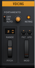 Portamento makes the note pitch glide from the previous note to the new one, at the time set with the Portamento knob.