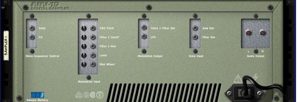 Connections On the back panel of the NN-19 you will find the connectors, which are mostly CV/Gate related. Audio Outputs These are the main left and right audio outputs. When you create a new NN-19 device, these are auto-routed to the first available channel on the audio mixer. Mono Sequencer Control These are the main CV/Gate inputs. CV controls the note pitch. Gate inputs trigger note on/off values plus a level, which can be likened to a velocity value. If you want to control the NN-19 from a Matrix Pattern Sequencer for example, you would normally use these inputs. The inputs are “mono”, i.e. they control one voice in the sampler. Modulation Inputs Remember that CV connections will not be stored in the sample patch, even if the connections are to/from the same NN-19 device! These control voltage (CV) inputs (with associated voltage trim pots), can modulate various NN-19 parameters from other devices, or from the modulation outputs of the same NN-19 device. These inputs can control the following parameters: • Osc (sample) Pitch • Filter Cutoff • Filter Resonance • Amp Level • Mod Wheel Modulation Outputs The Modulation outputs can be used to voltage control other devices, or other parameters in the same NN-19 device. The Modulation Outputs are: • Filter Envelope • LFO Gate Inputs These inputs can receive a CV signal to trigger the envelopes. Note that connecting to these inputs will override the “normal” triggering of the envelopes. For example, if you connected a LFO output to the Gate Amp input, you would not trigger the amp envelope by playing notes, as this is now controlled by the LFO. In addition you would only hear the LFO triggering the envelope for the notes that you hold down. • Amp Envelope • Filter Envelope