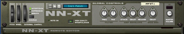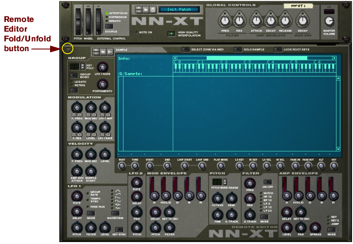 Panel overview The main panel When the NN-XT is added to the rack, you will initially only see the main panel. The NN-XT main panel. The main panel is where you load complete sample patches. It also contains the “global controls”. These are controls that affect and modify the sound of entire patches rather than the individual key zones. The Remote Editor panel To show/hide the remote editor panel, use the fold/unfold arrow at the bottom left. The remote editor panel is where you load individual samples, create key maps, modify the sound of the samples with synth parameters etc. The main panel of the NN-XT can be folded like any other Reason device. Note that folding the main panel will also fold the remote editor regardless of its current state.