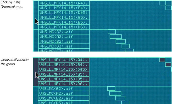 This will select all of the zones in the key map display. To deselect all zones, click in an unoccupied area in the Sample column or the key map area.