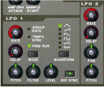 • NN-XT features two Low Frequency Oscillators - LFO 1 and LFO 2. “Normal” oscillators generate a waveform and a frequency, and produce sound. Low frequency Oscillators on the other hand, also generate a waveform and a frequency, but there are two major differences:In this mode, the LFO will run at the rate set for its group in the group section, rather than at the rate set here (see “Group parameters”). This way, all zones in the group will have the exact same modulation rate.