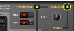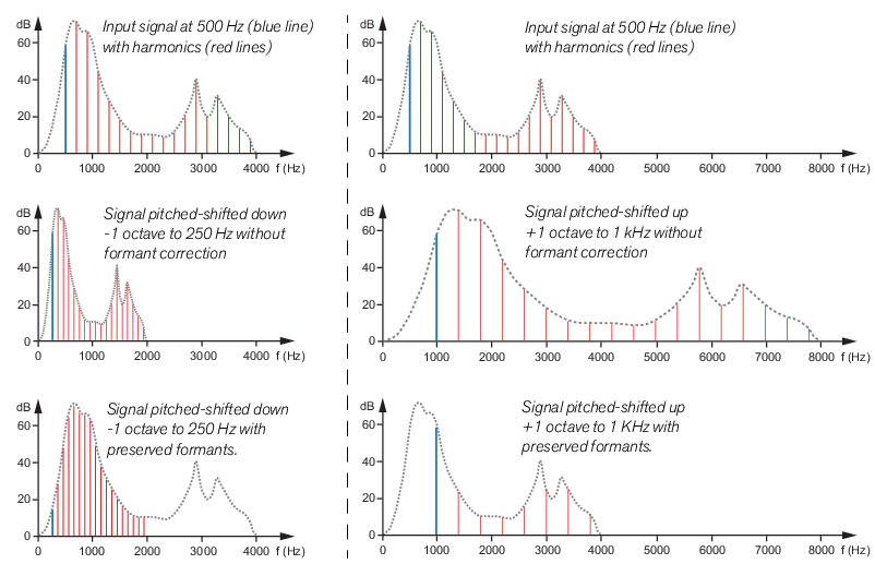 Using Formant control What are formants? Formants can be described as a sonic “footprint” of an acoustic space. The practical effect of formants could be compared to a multi-peak filter acting on the frequencies in a sound. An acoustic guitar, for example, has a body shape which makes is sound the way it does. The same goes for a human vocal tract (throat and mouth cavity); every human vocal tract has a unique “shape” which gives the voice its character. It is these shapes that produce formants. A big difference between a vocal tract and a guitar body, though, is that the vocal tract changes shape as you sing different vowels. This also means that the formants will change. When you pitch shift a signal up or down, the formant “multi-peak filter” will move up or down with the signal frequency (just like a traditional synthesizer filter would with full keyboard tracking activated). The result will be a signal that not only is pitched but also changes character. In some situations this might be what you want, but when it comes to pitch shifting vocals you will probably often want the pitch-shifted signal to sound like it’s sung by the same person. Therefore, Neptune features a formant control function. The Formant section in Neptune lets you control the formants so they don’t move along with the pitched signals. Neptune continuously samples and analyses the input audio and determines both the pitch and the current formants of the signal in real-time. The formants are then automatically applied to the pitch-adjusted output signal in real-time. The picture below shows schematic examples of a 500 Hz signal, pitch-shifted down and up one octave respectively, without and with formant correction. The formants are the peaks of the gray dotted lines in the graphs: Pitch-shifting without and with formant correction applied. The left column shows -1 octave pitch-shifting and the right column +1 octave. Using the Formant function When the Formant section is not active, the formants will move along with the pitched signal. On vocals this could generate unnatural “gender change” effects, especially on heavily pitched voices. If this is not the desired effect, you should activate the Formant section: 1. Activate the Formant function by clicking the Formant button. 2. Adjust the Formant shift with the Shift knob. The Shift range is ±1 octave. • The default 12 o’clock position means that the formants will be “locked” to the input signal and won’t move with the shifted pitches. Used on vocals this will give the impression of the same person singing at the adjusted pitches. (Refer to the picture in the “What are formants?” section for graphical examples of this particular Shift setting.) • Turned further counter-clockwise, the formants will be “locked” to the input signal and displaced downwards relative to the input signal. Used on vocals this will give the impression of a more deep male character voice. • Turned further clockwise, the formants will be “locked” to the input signal and displaced upwards relative to the input signal. Used on vocals this will give the impression of a more soprano/female/child character voice. Note that Voice Synth has its own separate “built-in” formant correction and is not affected by the Formant section settings.