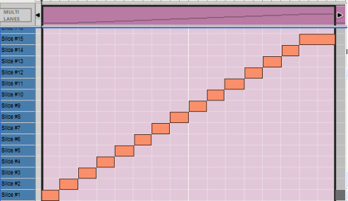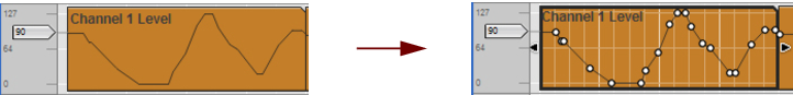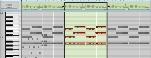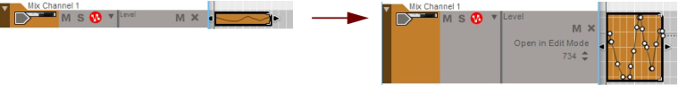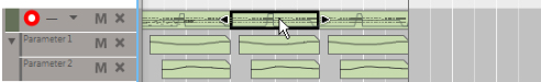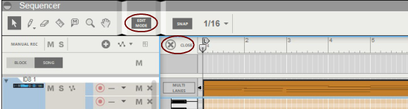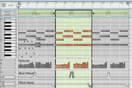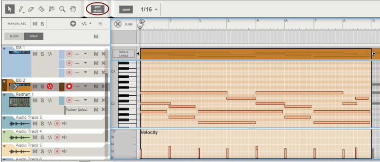 The Edit Mode shows the contents of a single lane at a time on the Edit Pane - unless you use the Multi Lanes function, described in “Multi Lanes editing”, where you can see the contents of multiple note lanes in a “ghosted” fashion underneath the currently open clip. On instrument tracks, only one note lane can have edit focus at a time.Also, all parameter automation lanes will be shown at the bottom of the Edit Pane. If a single clip was selected on the note lane with edit focus when you switched to Edit Mode, it will automatically be opened. If no clip was selected, the events will be grayed out. To be able to edit or draw notes and/or automation events, you need to open the clip, for example by double-clicking it (see “Opening note and automation clips for editing”).Note clips can contain both note events - with velocity values - and performance controller events. By default, performance controllers include Mod Wheel, Pitch Bend, Sustain Pedal, Aftertouch, Expression and Breath Controller. However, the controller configuration can easily be changed (see “Creating new performance controller automation lanes” and “Deleting performance controller automation lanes”).See “Editing parameter automation in the Song/Block View” for information on how to edit parameter automation events in the Song/Block View.See “Editing parameter automation in Edit Mode” for information on how to edit parameter automation events in Edit Mode.To the right of the Note Edit Lane, below the Vertical Zoom tools, is the Note Edit Mode Selector. Click to choose between Key Edit, Drum Edit or REX Edit Mode. Depending on selected mode, the Note Edit Lane will display differently. See more about the different modes in “Note Edit Modes”.Each performance controller you used when recording the note clip has its own separate Performance Controller Edit Lane. You can add or delete performance controller edit lanes from the clip using this selector. See the “Creating new performance controller automation lanes” and “Deleting performance controller automation lanes” for more details.Here you can edit the notes of one open clip at a time. Note events are displayed as orange horizontal “boxes” in a piano roll fashion on the Note Edit Lane. The left side of each box indicates Note On (key down) and the right side Note Off (key up). The color intensity of each box indicates the velocity for the corresponding note. Depending on selected Note Edit Mode (see “Note Edit Modes”), the contents of the Note Edit Lane will display differently.The Velocity Edit Lane shows the velocity values for each of the recorded notes. Velocity values are automatically recorded together with notes. See more about editing velocity values in “Editing note velocity”.On the Performance Controller Edit Lanes are the performance controller events for Mod Wheel, Pitch Bend, Sustain Pedal etc. Performance controller events are automatically distributed on separate lanes for each recognized controller during recording. Even though performance controllers belong to separate note clips, they will affect all active parallel note lanes on a track. See “Automation editing” for details on how to edit performance controller events.Any recorded parameter automation will be shown in separate clips, on separate Parameter Automation Lanes. Parameter automation clips don’t “belong” to the note lane or to any note clips, and will not be opened together with note clips. Double-clicking on a parameter automation clip will open it for editing. See “Automation editing”.The Static Value Handles to the left of the Performance Controller Edit Lanes and Parameter Automation Lanes indicate to what value the automated controller/parameter will default to where there are no clips on the lane. Basically, this value reflects the parameter’s initial value, before it was automated. You can easily change a parameter’s Static Value by dragging the Static Value Handle up or down. See “Automation editing” for more details.