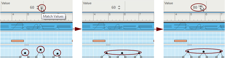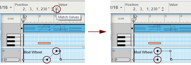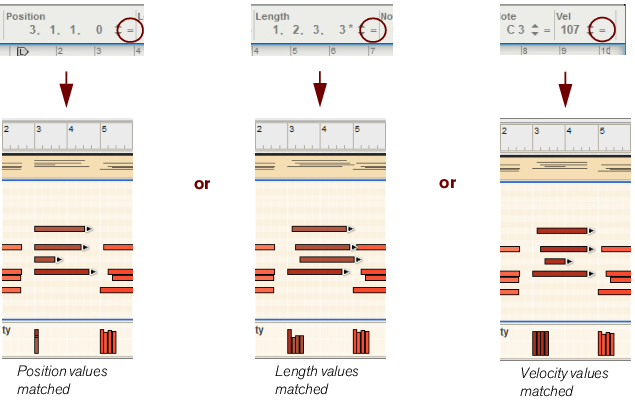 If several selected events have the same start position, the matching will be to the values for the event with the lowest Note value (for note events) or lowest Value (for automation events).