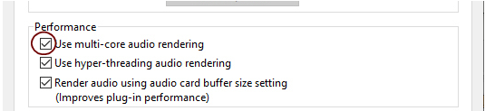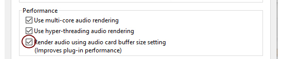 The “Render audio using audio card buffer size setting” function should be selected (checked) for best plugin performance. When selected, the audio batches are rendered internally according to the set Buffer size (see “Making Buffer Size adjustments in the Reason Preferences dialog” above). For example, if you have a Buffer size of 512 Samples, each audio batch will be 512 samples internally. Raising the Buffer size will let Reason process larger audio batches in one go, which is often more efficient. Many plugins are also more efficient when doing larger audio batches. if you are using DSP-heavy VSTs (mastering effects, for example), these will run a lot smoother with this function selected.