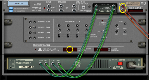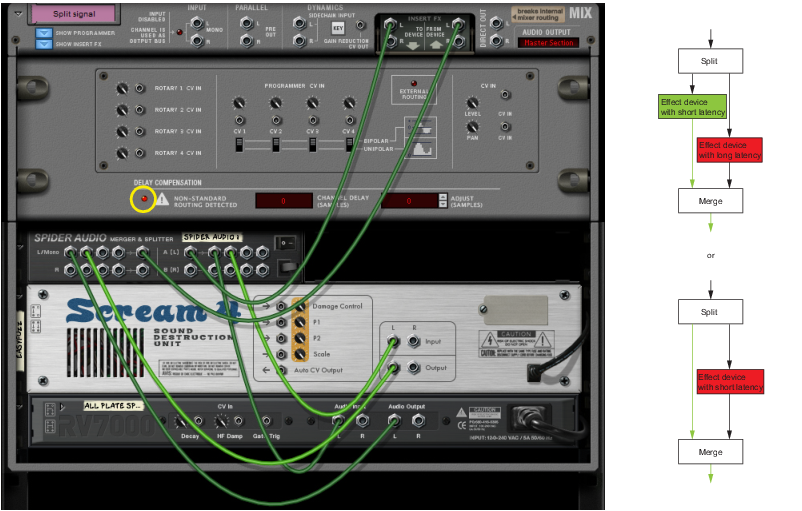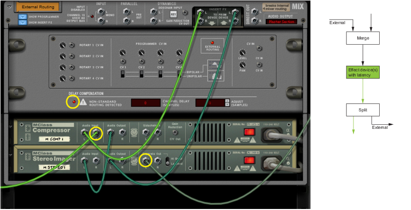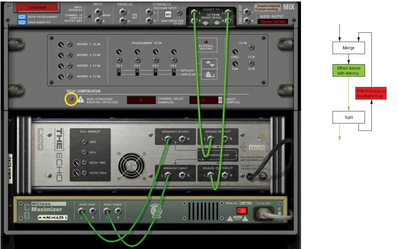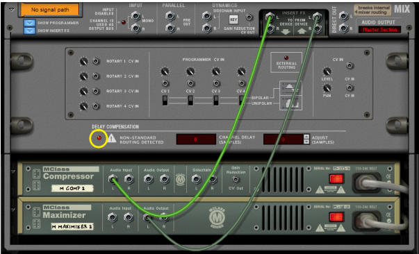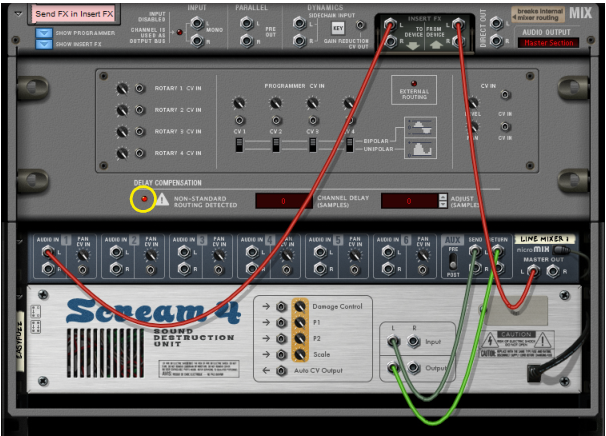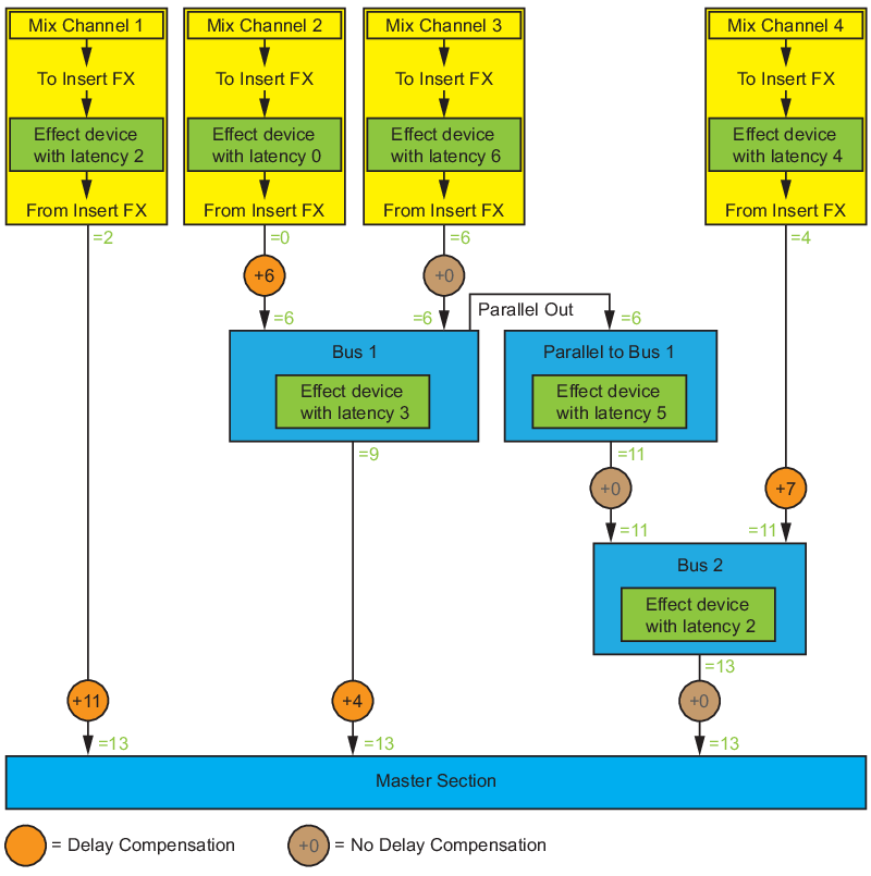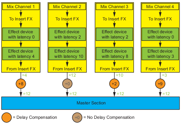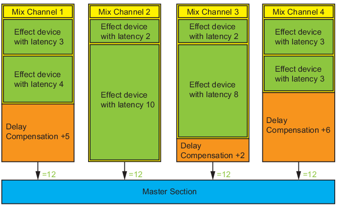 What Reason then does to compensate for the inherent latencies in effect devices is to automatically add “invisible delays” to the signals of the other mixer channels. The goal for the delay compensation is to have all mixer channel signals arriving at exactly the same time to the Master Section of the main mixer.