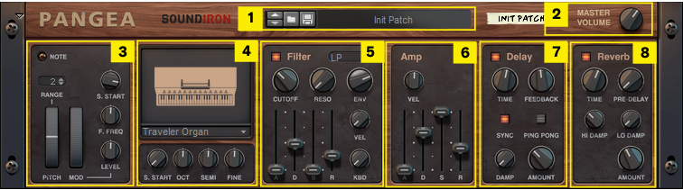 Panel overview The Pangea front panel contains the following sections: The Pangea front panel sections. • 1. Patch Selector (for browsing, loading and saving patches). • 2. Master Volume. • 3. Global performance and “play” controls. • 4. Instruments section. • 5. Filter section. • 6. Amp Envelope section. • 7. Delay effect section. • 8. Reverb effect section.